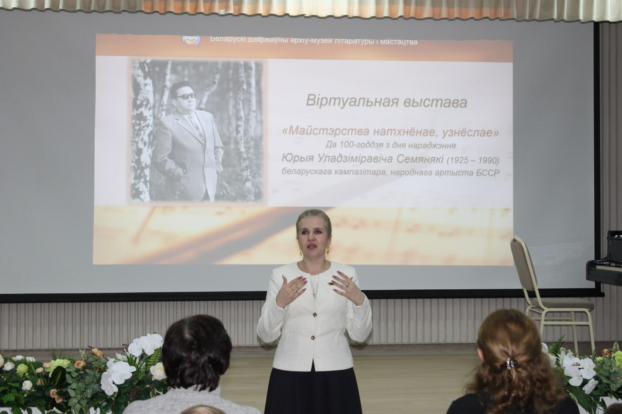 Загадчыца аддзела інфармацыі, публікацыі і выкарыстання дакументаў БДАМЛМ В.В.Біруля прэзентавала віртуальную выставу «Майстэрства натхнёнае, узнёслае», падрыхтаваную на аснове асабістых дакументаў кампазітара з фондаў БДАМЛМ. У ёй прадстаўлены дакументы, якія ілюструюць творчы шлях і грамадскую дзейнасць творцы: нотныя рукапісы, афішы і праграмы спектакляў, падзякі, віншавальныя тэлеграмы і лісты ад вядомых дзеячаў культуры.