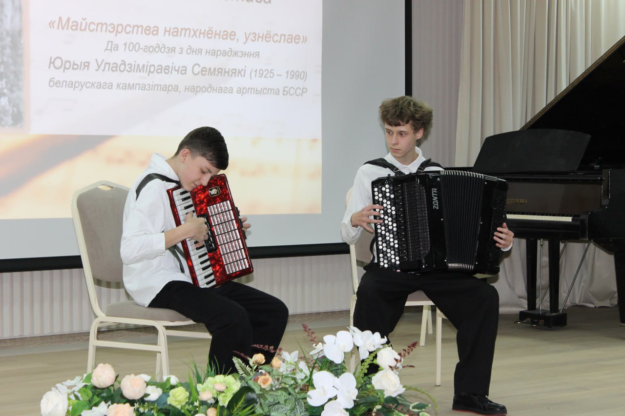 Вечар упрыгожылі разнастайныя музычныя нумары, якія выканалі выкладчыкі і навучэнцы сярэдняй школы № 4 і дзіцячай музычнай школы мастацтваў № 2 ім. М.І.Аладава. Прагучалі творы на музыку Ю.У.Семянякі – галоп з оперы «Калючая ружа», песня «Люблю цябе, Белая Русь».