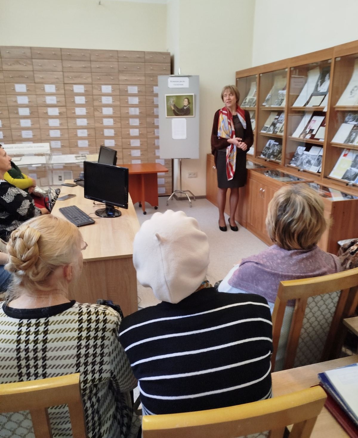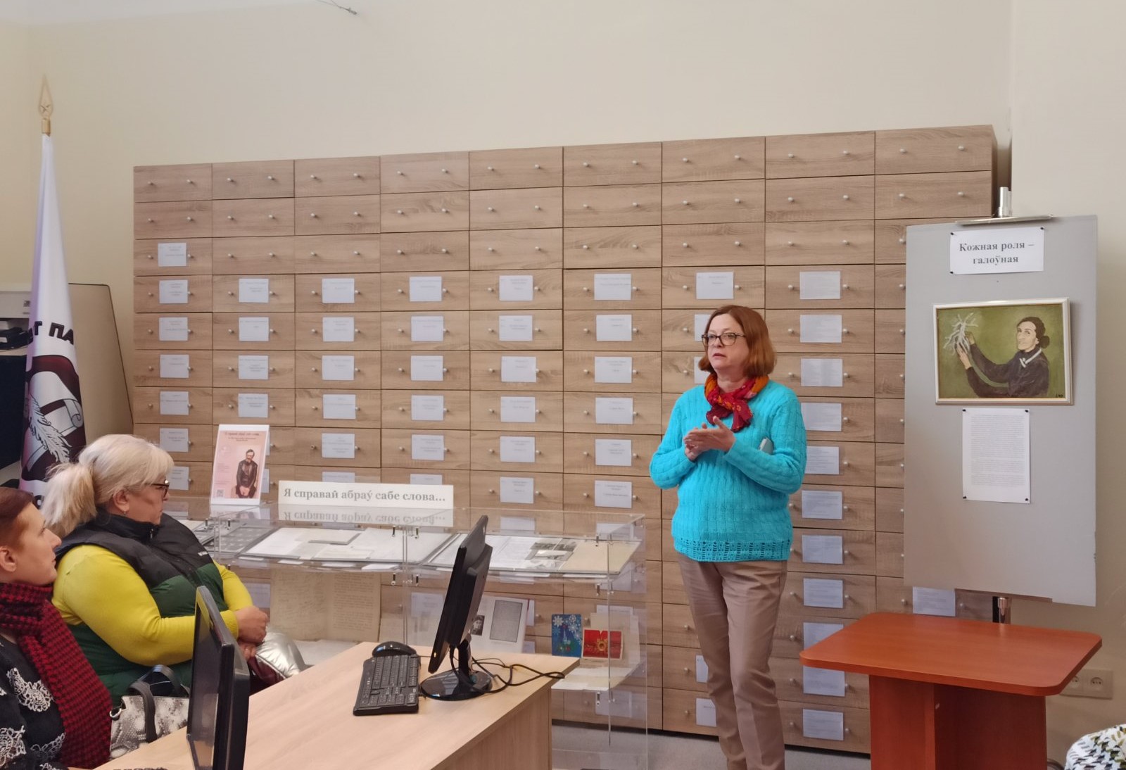 Гости архива познакомились с литературно-документальными выставками, которые экспонируются в читальном зале. Ведущий архивист Т.А.Анпилогова представила литературно-документальную выставку «Я справай абраў сабе слова», посвящённую 100-летию со дня рождения белорусского поэта, прозаика, переводчика Наума Кислика. Ведущий архивист Н.А.Мизон рассказала посетителям об экспозиции «Кожная роля – галоўная», приуроченной к 120-летию народной артистки СССР, актрисы театра и кино Стефании Станюты.