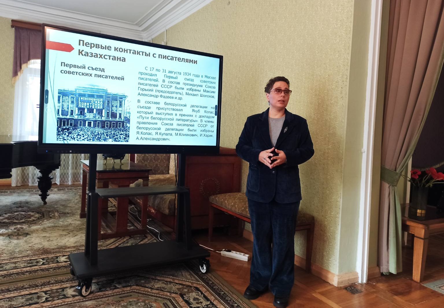 Главный хранитель фондов Государственного литературно-мемориального музея Якуба Коласа В.В.Мицкевич детально осветила многогранные связи белорусских и казахских пистателей, уделив особое внимание роли Якуба Коласа в развитии этих связей.